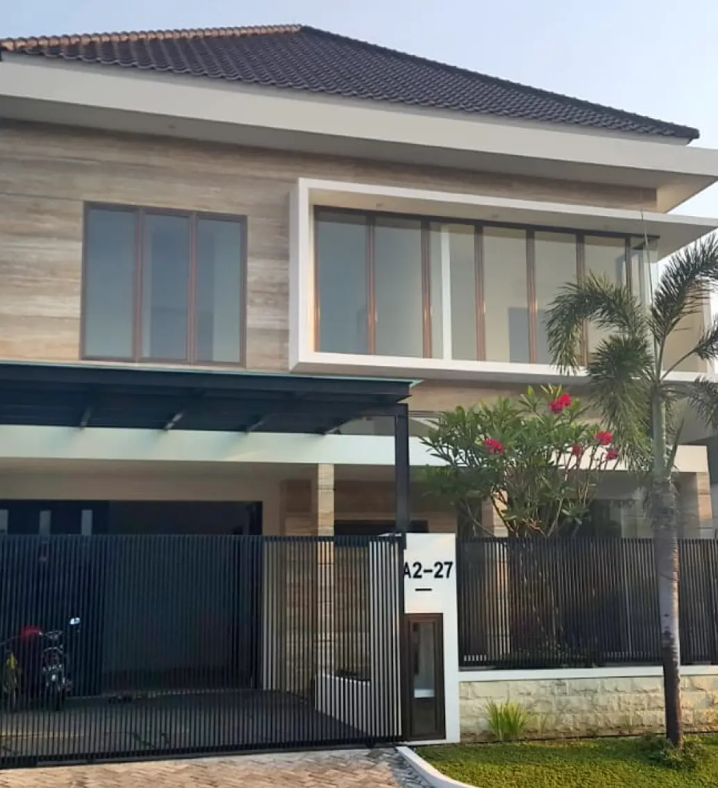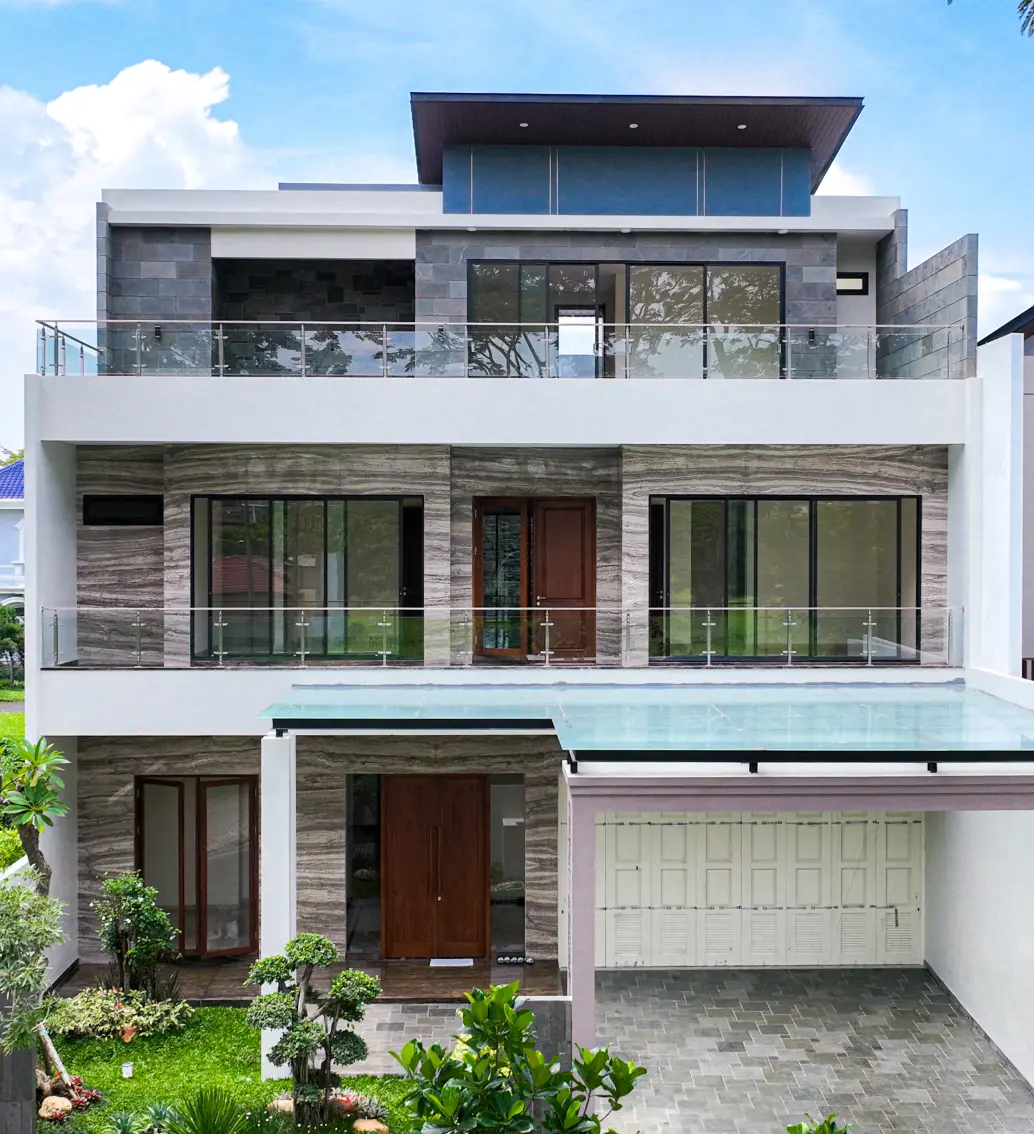 Hunian modern classic yang tampil mewah melalui penggunaan marmer sebagai elemen utama, baik pada dinding fasad maupun lantainya. Perpaduan garis tegas modern dengan detail elegan khas klasik menghadirkan tampilan yang berkelas, bersih, dan timeless. Bukaan kaca lebar serta komposisi warna netral semakin menonjolkan karakter rumah yang megah namun tetap hangat dan nyaman dihuni.